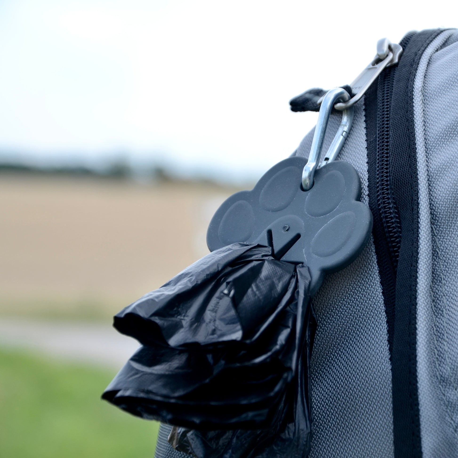 Zieh einfach die leeren Hundetüten zur Hälfte oder den vollen Kotbeutel bis kurz nach dem Knoten durch das Loch und befestige den Halter an der Leine, an der Gassitasche oder auch am Rucksack.
