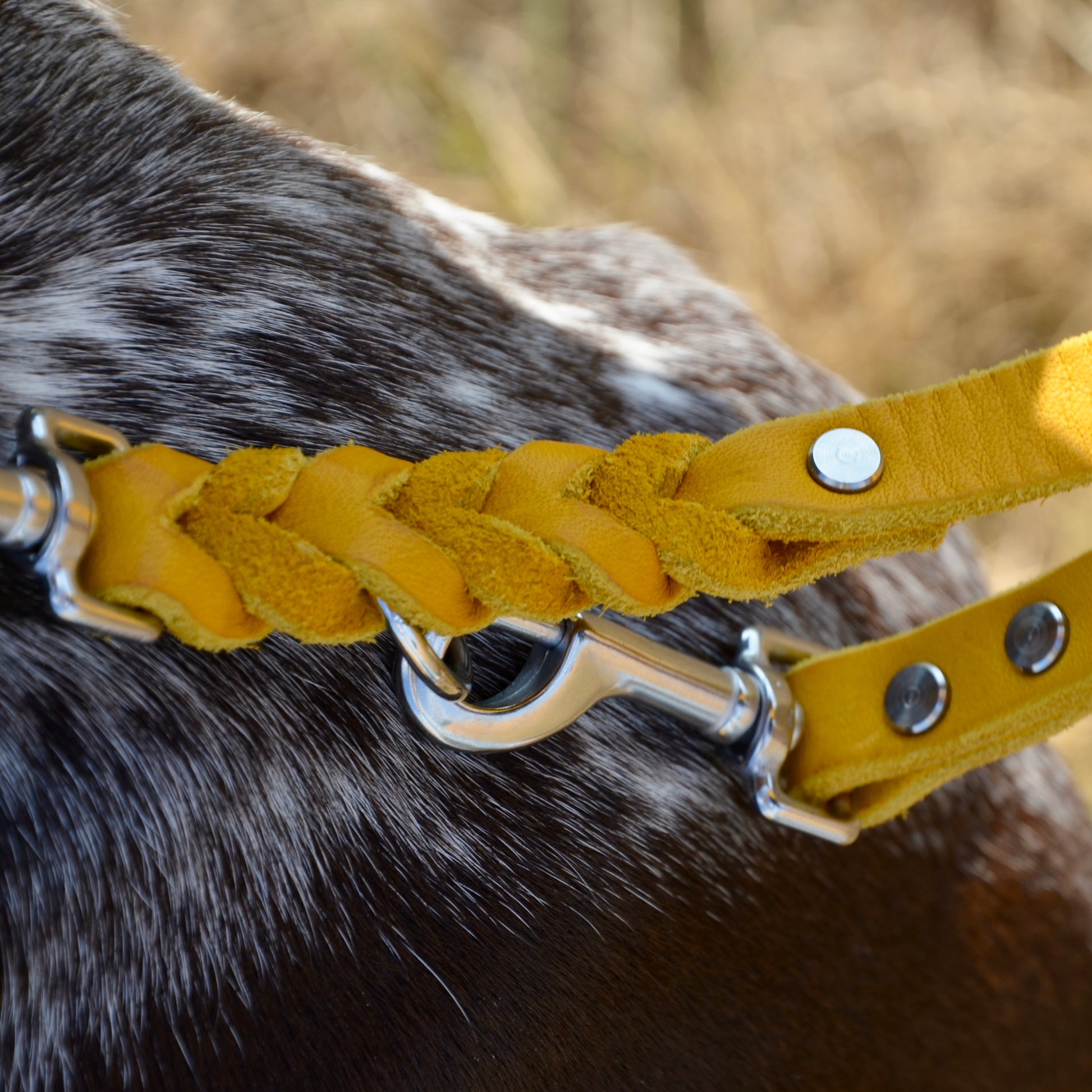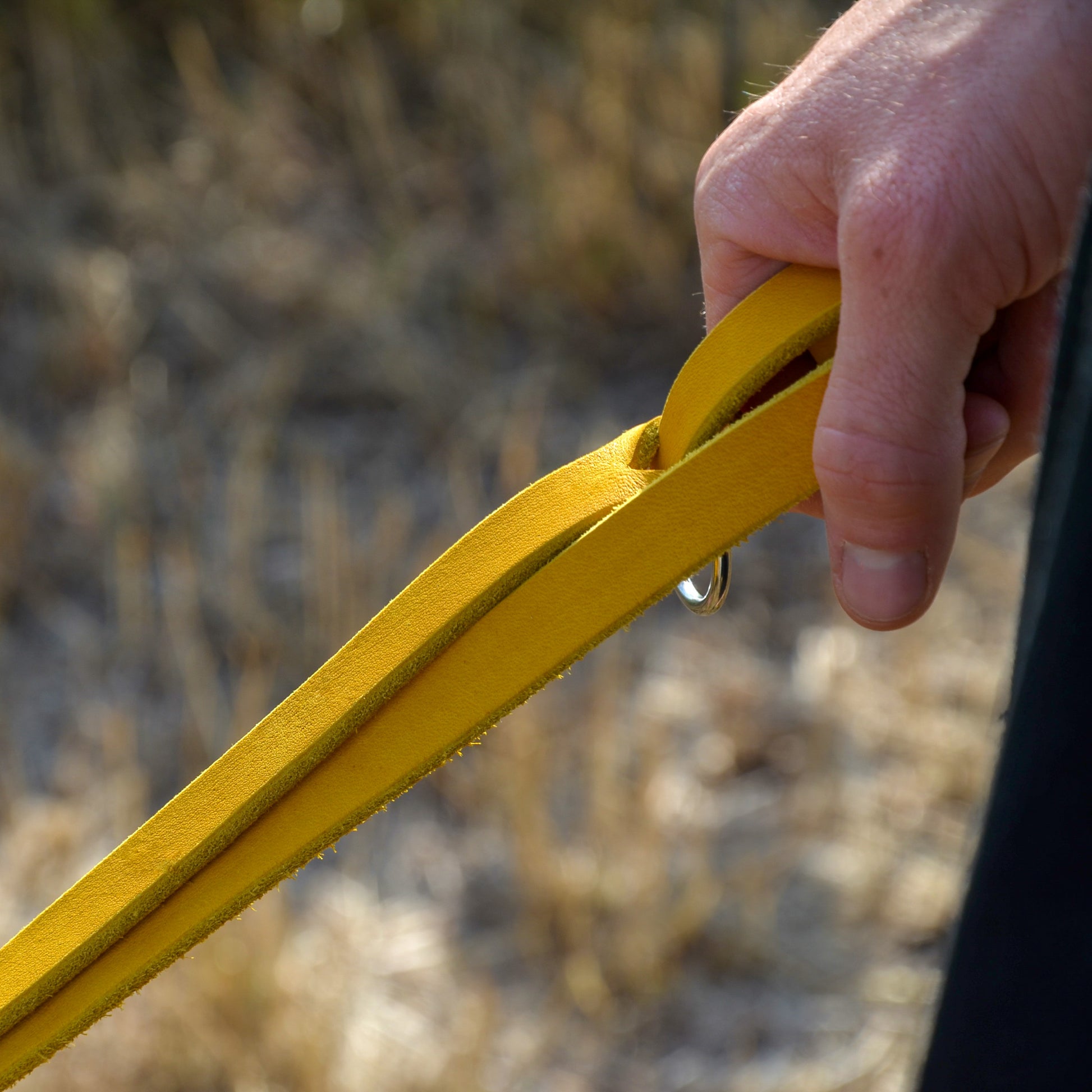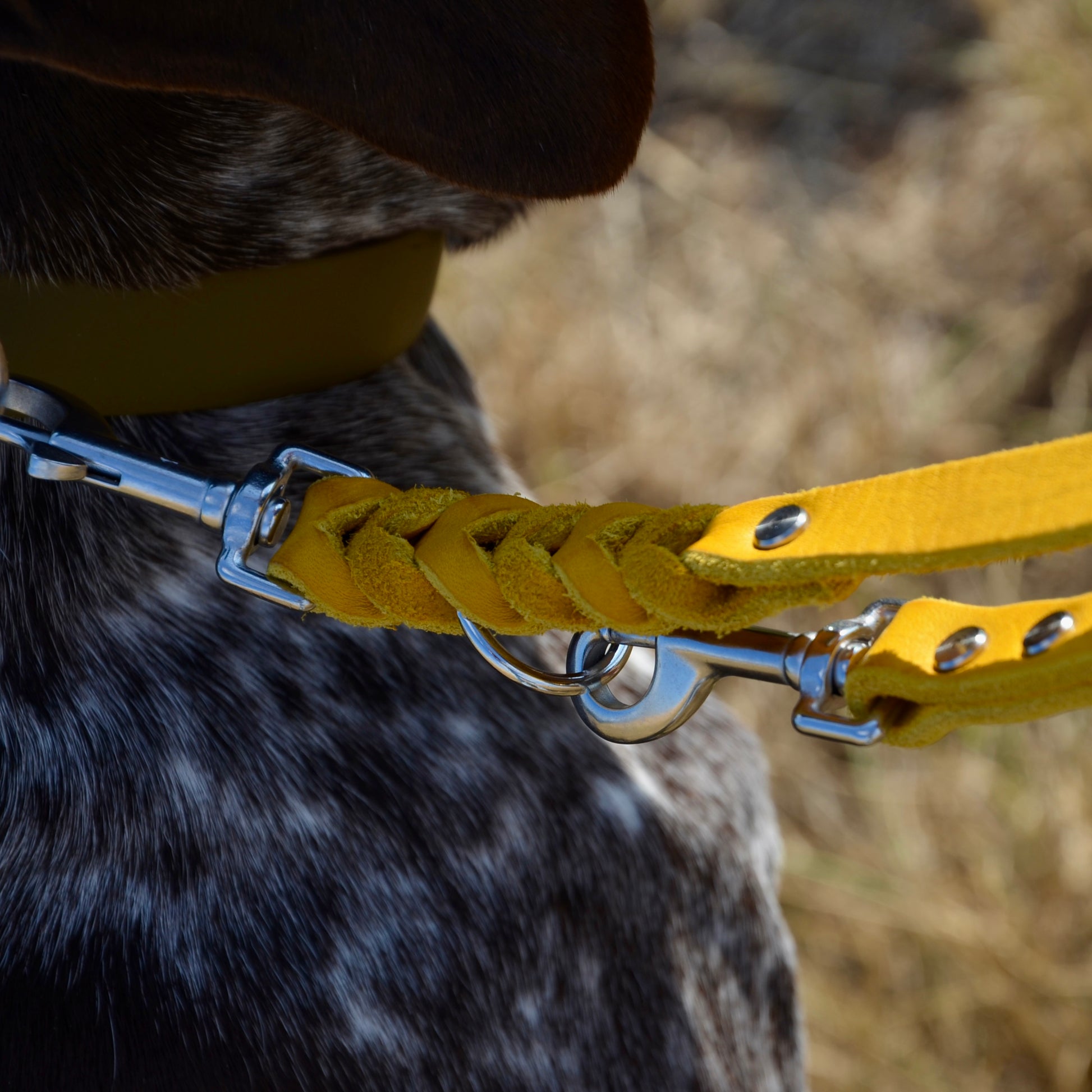 Suchst Du eine robuste, zeitlose und hochwertige Hundeleine, die Dich und Deinen Pfotenheld durch alle Abenteuer begleitet? Dann ist unsere mit Liebe, von Hand gefertigte ROCDOG WALDLÄUFER-Fettlederleine in edlem Curry-Gelb genau das Richtige für Dich!