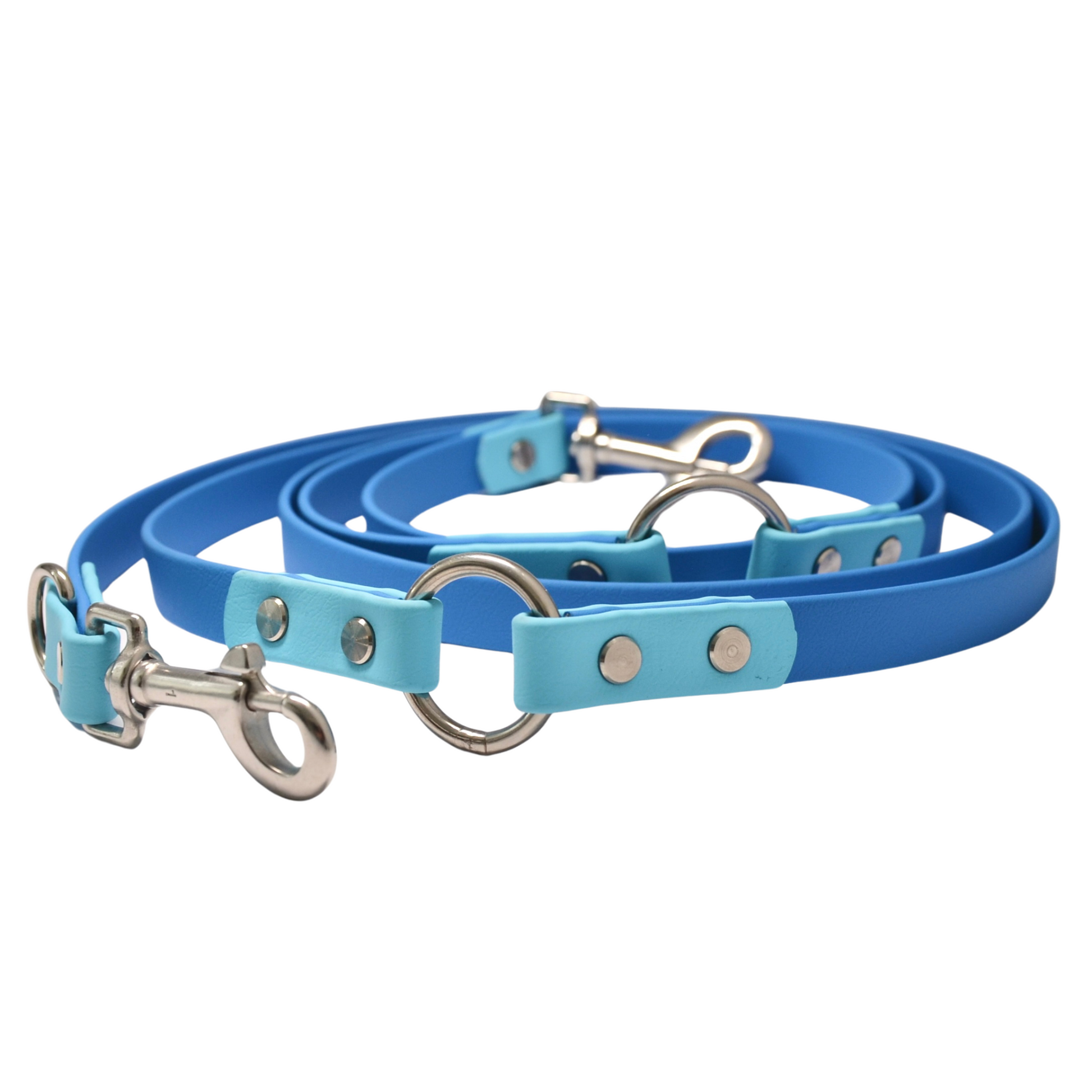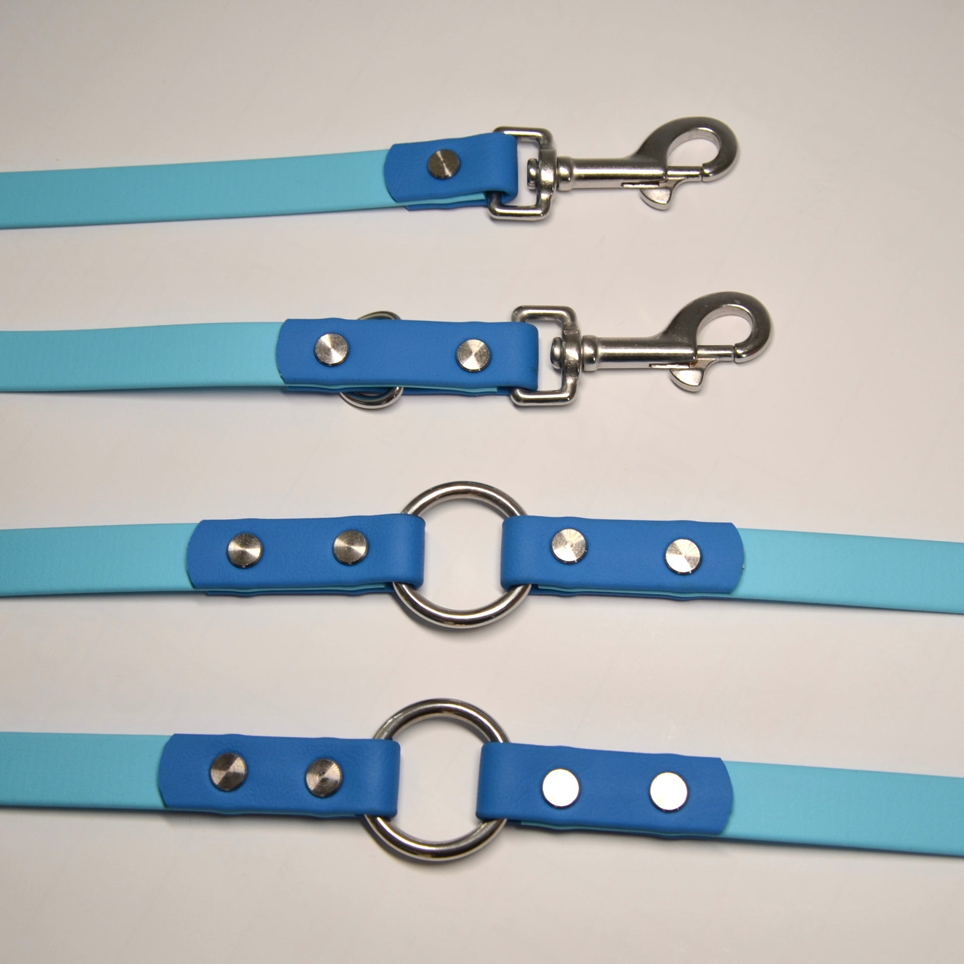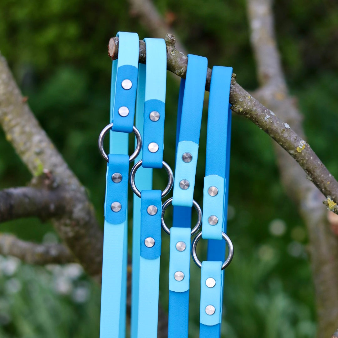 Die Leine kann in zwei verschiedenen Farbkombinationen bestellt werden – Azurblau mit türkisenen Akzenten oder Türkis mit azurblauen Akzenten.
